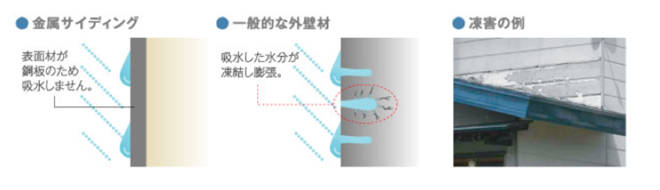 アイジーの金属サイディングは表面材が銅板のため吸収がなく凍害の心配がありません。
